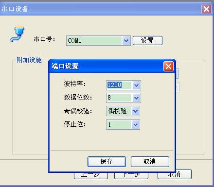 串口設備設置,選擇正確的串口號。然后設置端口。波特率初始為1200,數(shù)據(jù)位數(shù)8,偶校驗,停止位1.
