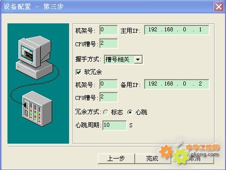 圖2中,冗余系統(tǒng)由A和B兩套PLC控制系統(tǒng)組成,初始狀態(tài),A系統(tǒng)為主站,B系統(tǒng)備用站,當(dāng)主系統(tǒng)A中的任何一個組件出現(xiàn)故障時,控制任務(wù)會自動切換到備用系統(tǒng)B中執(zhí)行。這時,B系統(tǒng)為主站,A系統(tǒng)為備用站,系統(tǒng)運行過程中,即使沒有任何組件出錯,操作人員也可以通過設(shè)定控制字,實現(xiàn)手動的主備系統(tǒng)切換。 當(dāng)主備系統(tǒng)切換時,為了保證上位機的正常切換,則在力控軟件需要進(jìn)行相應(yīng)的配置。冗余切換實現(xiàn)方式有兩種:標(biāo)志和心跳(如圖3所示),需要配合的PLC的程序的使用。首先在PLC的程序中做一個標(biāo)志字(心跳字),然后在力控數(shù)據(jù)庫組態(tài)中組態(tài)一個對應(yīng)的點連接即可。