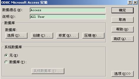 本例中,在[圖1-6]“數(shù)據(jù)源名(N):”中輸入“Access”,在“說明(D):”中輸入“All USER”,如[圖4-47]所示。如果在此創(chuàng)建新數(shù)據(jù)庫,創(chuàng)建過程參見下節(jié)的“創(chuàng)建數(shù)據(jù)庫”。