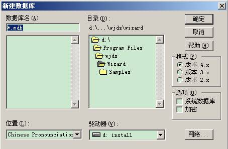 在[圖1-7]中,單擊 按鈕,彈出類似于[圖4-53]的“新建數(shù)據(jù)庫”窗口,在窗口“目錄”欄中選擇“D:\”,在“數(shù)據(jù)庫名(A)”中,輸入數(shù)據(jù)庫名稱為“table1.mdb”,注意:“格式(F)”使用默認(rèn)的“版本 4.x”,這是Microsoft Jet 數(shù)據(jù)庫引擎的格式。4.x 版為最新版,格式為 Unicode。