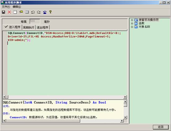 單擊[腳本]-[應(yīng)用]菜單,出現(xiàn)[圖1-1]所示“應(yīng)用程序腳本”窗口,在“進(jìn)入程序”選項(xiàng)卡中使用函數(shù)SQL Connect(ConnectID ,SourceDesc)可實(shí)現(xiàn)實(shí)時(shí)數(shù)據(jù)庫與關(guān)系型數(shù)據(jù)庫Access 2003的連接。