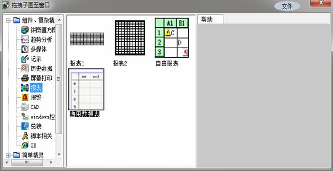 創(chuàng)建通用數(shù)據(jù)表:打開“拖拽子圖到窗口/組件、復(fù)雜精靈/報表/通用數(shù)據(jù)表”。如下圖: