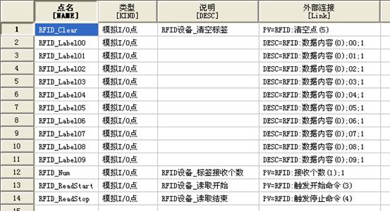 在點組態(tài)中根據(jù)需要建立一組標(biāo)簽內(nèi)容讀取的點,以及讀取的開始結(jié)束、標(biāo)簽接收個數(shù)、清空等控制點: