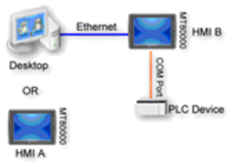 2 、控制連接在其它HMI上的PLC 透過以太網(wǎng)絡(luò),PC與HMI可以操作連接在其它HMI上的PLC;舉例來說,假設(shè)現(xiàn)有一臺三菱PLC連接到HMI B的COM 1,當PC或HMI A欲讀取此臺PLC上的數(shù)據(jù),則PC端或HMI A上所使用工程檔案設(shè)定步驟如下:
