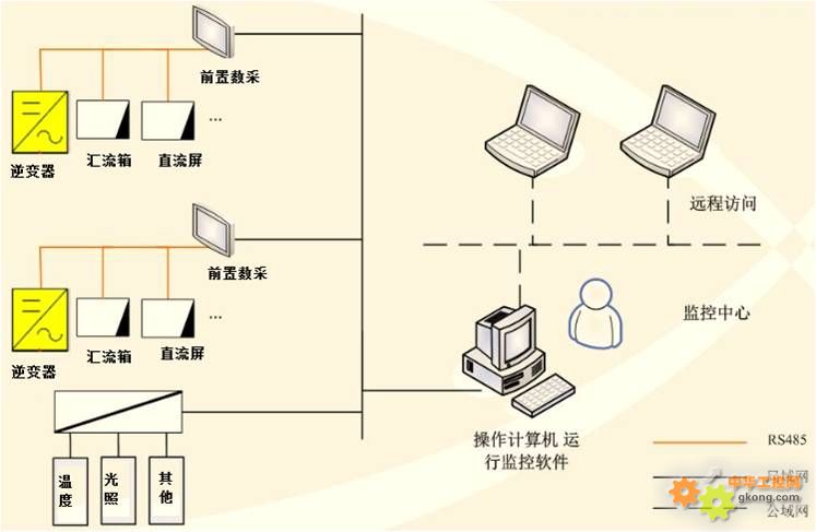 本光伏電站監(jiān)控系統(tǒng)將光伏電站的逆變器、匯流箱、氣象儀、電表等設(shè)備通過數(shù)據(jù)線連接起來,用光伏電站數(shù)據(jù)采集器進(jìn)行這些設(shè)備的數(shù)據(jù)采集,并通過GPRS、以太網(wǎng)、WIFI等方式上傳到網(wǎng)絡(luò)服務(wù)器或本地電腦,使用戶可以在互聯(lián)網(wǎng)或本地電腦上查看相關(guān)數(shù)據(jù),方便電站管理人員和用戶對光伏電站的運(yùn)行數(shù)據(jù)查看和管理。