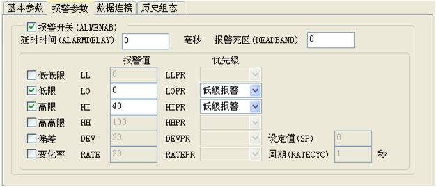首先在紫金橋軟件中定義一個模擬IO點,點名為Temp1,按照需要設(shè)置點的外部鏈接。然后在報警參數(shù)中選中報警開關(guān),將低限設(shè)置為0,高限設(shè)置為40。保存這個點的設(shè)置并退出點定義畫面。報警設(shè)置如下圖所示: