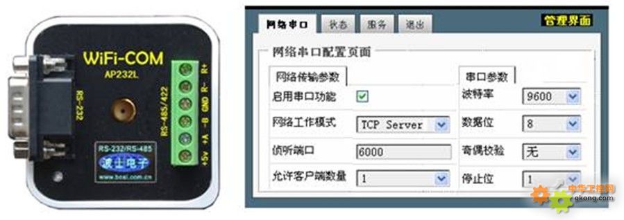 用以太網(wǎng)或者WIFI網(wǎng)卡搜索AP232L并且連接,即可擴(kuò)展出串口。AP232L不僅可以作為無(wú)線(xiàn)路由器(默認(rèn)模式),還可以作為無(wú)線(xiàn)熱點(diǎn)模式、WDS模式、無(wú)線(xiàn)客戶(hù)端等共四種模式,所有這些模式的更改和配置都可以通過(guò)AP232L內(nèi)置的設(shè)置頁(yè)面來(lái)完成,AP232L默認(rèn)的IP地址為:192.168.1.1。用瀏覽器打開(kāi)這個(gè)IP地址,頁(yè)面非常簡(jiǎn)單,在“網(wǎng)絡(luò)串口”選項(xiàng)下設(shè)置串口的TCP工作模式、端口號(hào)、波特率等,其它選項(xiàng)與普通無(wú)線(xiàn)路由器的一樣。如果不用到路由器上網(wǎng)功能,連路由器選項(xiàng)的設(shè)置部分都省了。只要用戶(hù)會(huì)設(shè)置無(wú)線(xiàn)路由器就肯定會(huì)設(shè)置AP232L,AP232L是迄今為止設(shè)置最為簡(jiǎn)單的WiFi串口產(chǎn)品。串口包括DB-9針的RS-232口和接線(xiàn)端子的RS-485/422口。AP232L的“虛擬串口軟件”與ETH232L的完全一樣。設(shè)置好后則會(huì)在計(jì)算機(jī)的“設(shè)備管理器”中查看到一個(gè)新的COM串口。