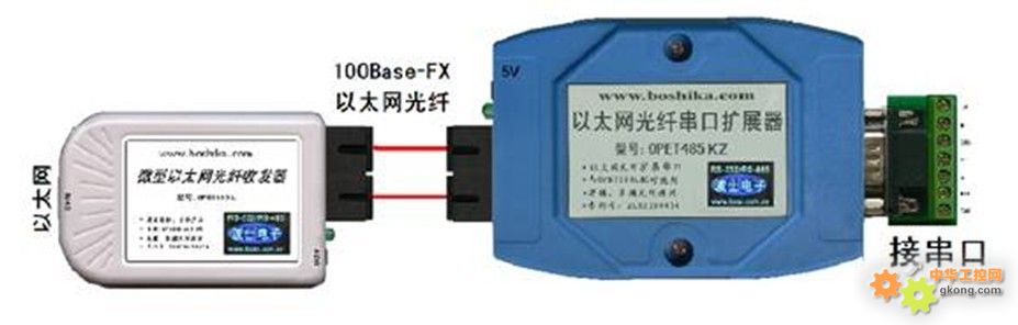 以太網(wǎng)光纖/串口擴(kuò)展器的典型應(yīng)用為:遠(yuǎn)端的OPET485KZ型(接串口設(shè)備)和近端OPET100L型(接計(jì)算機(jī)或者以太網(wǎng)HUB的RJ-45口),中間通過(guò)光纖連接。遠(yuǎn)端OPET485KZ型的串口為1個(gè)DB-9針座,接RS-232/485/422設(shè)備,產(chǎn)品需要5V供電。近端OPET100L型的以太網(wǎng)口接計(jì)算機(jī)或者HUB的以太網(wǎng),5V供電。遠(yuǎn)端OPET485KZ型與近端OPET100L型之間用2根SC頭光纖相連,注意這2個(gè)光口必須交叉連接。先通過(guò)OPET100L將以太網(wǎng)通過(guò)光纖延長(zhǎng)到遠(yuǎn)端,然后將遠(yuǎn)端的以太網(wǎng)光口(100Base- FX)通過(guò)OPET485KZ轉(zhuǎn)換成為串口,這樣就通過(guò)光纖在遠(yuǎn)端擴(kuò)展出了串口。