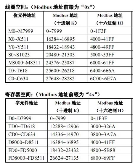 元件類型:支持的物理設備元件;可編程控制器內(nèi)部軟元件編號與對應的 Modbus地址編號入下表示: