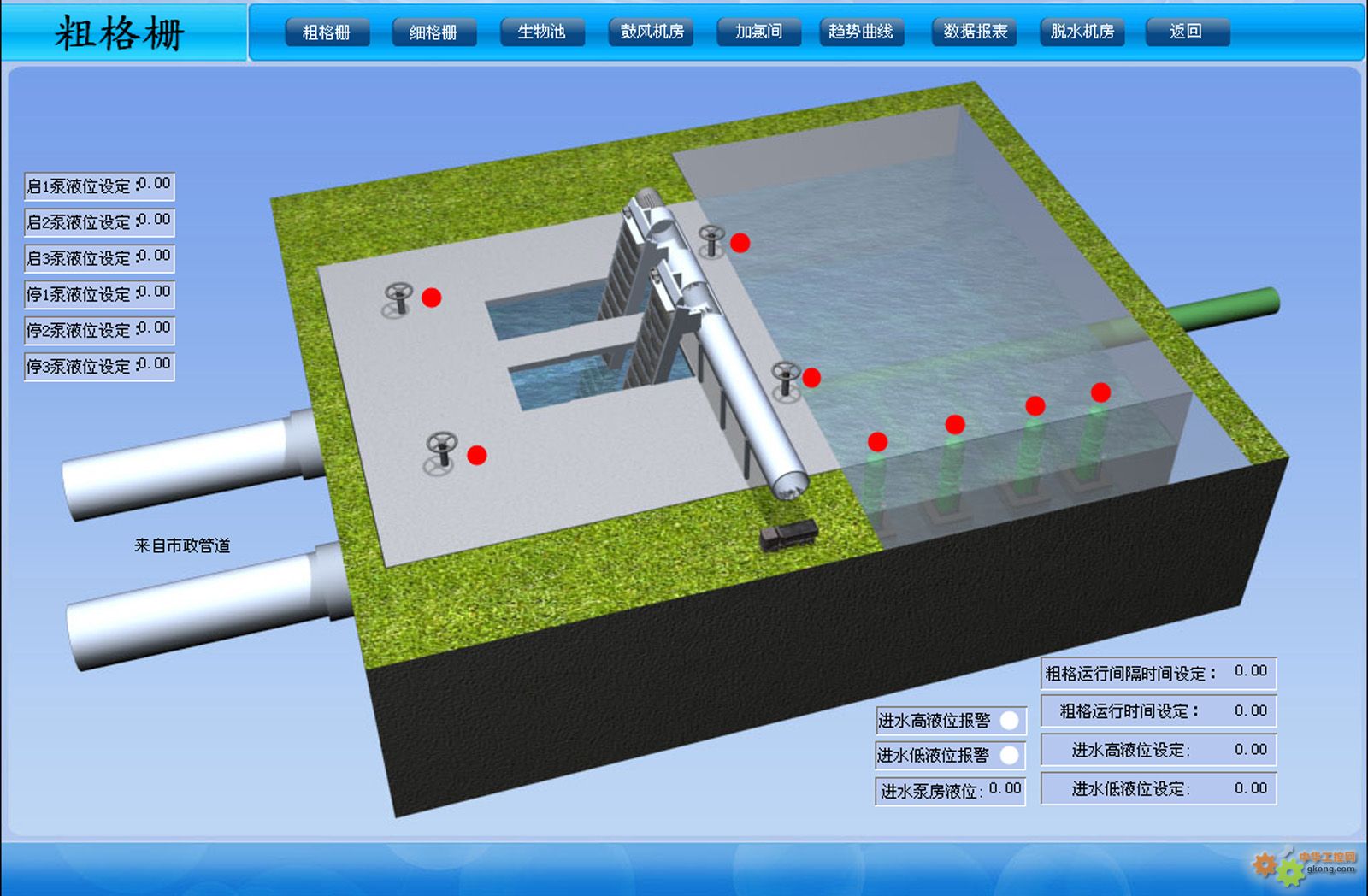 細(xì)格柵的間距比粗格柵小,為4mm,主要作用是進(jìn)一步攔截污水中的污物。需要檢測(cè)格柵水位差、流量、泵狀態(tài)等參數(shù)。