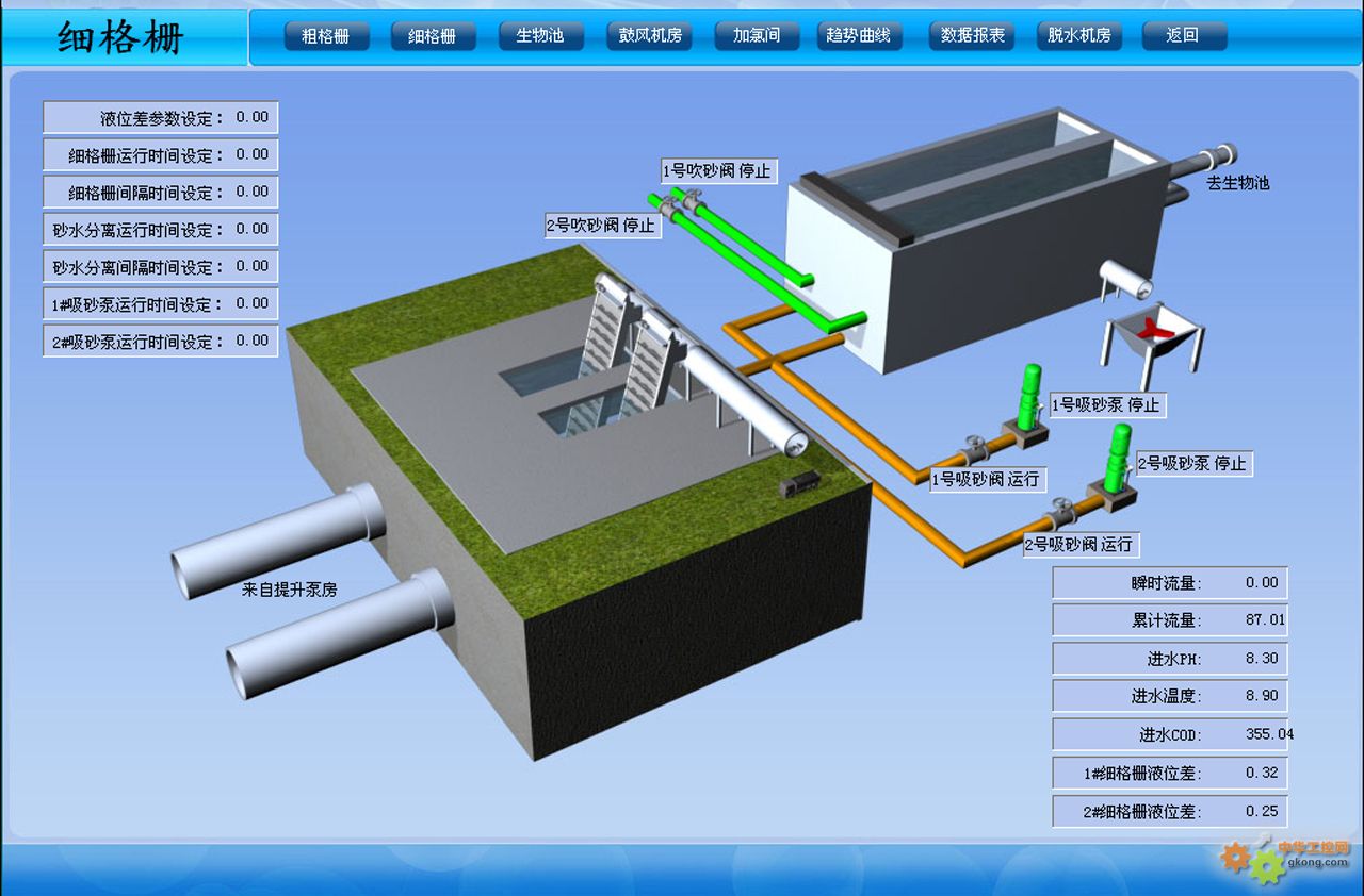 爬式粗格柵,進(jìn)水經(jīng)過粗格柵間過濾一些大的固體雜質(zhì),去除那些可能對(duì)水泵有影響的無機(jī)物。需要監(jiān)測(cè)格柵水位差、進(jìn)水流量、進(jìn)水酸堿度、進(jìn)水COD、提升泵狀態(tài)等參數(shù)。