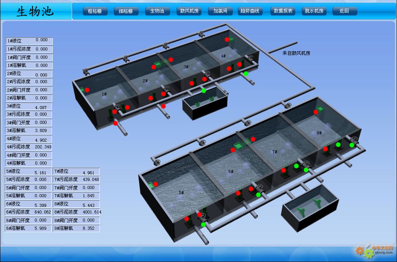 系統(tǒng)以美觀、友好的界面顯示設(shè)備運(yùn)行狀態(tài)、流量、水位、COD、超聲波液位計(jì)、溶解氧計(jì)、氧化還原電位計(jì)、污泥濃度計(jì)、電磁流量計(jì)、等數(shù)據(jù),并以仿真圖、直方圖和曲線圖、棒圖等多種方式清晰直觀的顯示各個(gè)敏感數(shù)據(jù),方便用戶對(duì)各敏感數(shù)據(jù)進(jìn)行歷史查詢和對(duì)比分析。