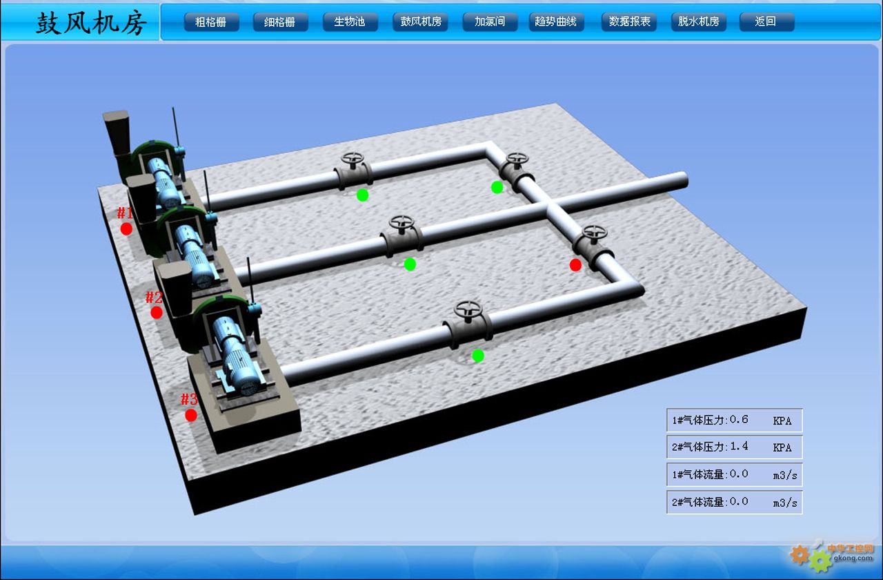鼓風(fēng)機(jī)房負(fù)責(zé)對(duì)反應(yīng)池進(jìn)行鼓風(fēng)曝氣,該鼓風(fēng)機(jī)房設(shè)置3臺(tái)鼓風(fēng)機(jī),兩用一備。需要檢測(cè)閥門、鼓風(fēng)機(jī)狀態(tài)等參數(shù)。
