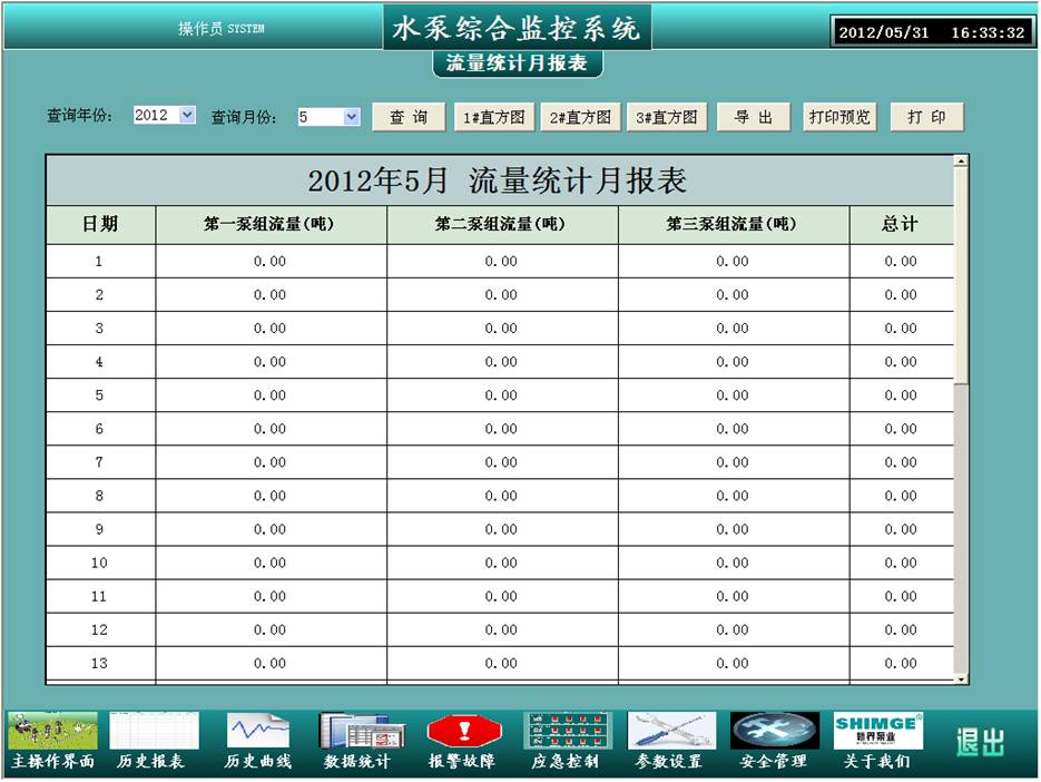 自動統(tǒng)計設(shè)備的出水流量。可以按天、按月、按年查詢,以報表形式或者直方圖形式顯示出來,以便分析設(shè)備在不同日期的運行情況。