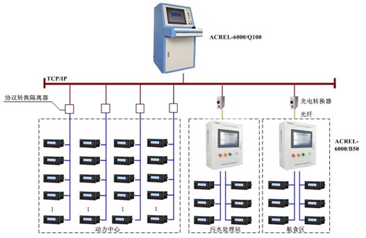 本工程共分為 3 個(gè)監(jiān)控區(qū)域,分別為航食區(qū)、污水處理站以及動(dòng)力中心。其中航食區(qū)及污水處理站現(xiàn)場監(jiān)測回路較少,分別為 24 及 38 個(gè)監(jiān)控回路,動(dòng)力中心共計(jì) 96 個(gè)監(jiān)控回路,本工程在配電柜現(xiàn)場均安裝 ARCM200 系列剩余電流監(jiān)控探測器及 AKH-0.66/L 型剩余電流互感器。在航食區(qū)及污水處理站管理層配置 AcrelAcrel-6000/B50 壁掛式電氣火災(zāi)監(jiān)控系統(tǒng);在動(dòng)力中心設(shè)立琴臺(tái)式電氣火災(zāi)監(jiān)控系統(tǒng) Acrel-6000/Q100 。三個(gè)電氣火災(zāi)監(jiān)控系統(tǒng)在地理上分布于三個(gè)管理區(qū)域,每套系統(tǒng)又通過局域網(wǎng)組成一個(gè)有機(jī)的整體,將各處的漏電及溫度信息進(jìn)行共享,便于機(jī)場工作人員進(jìn)行統(tǒng)一管理。