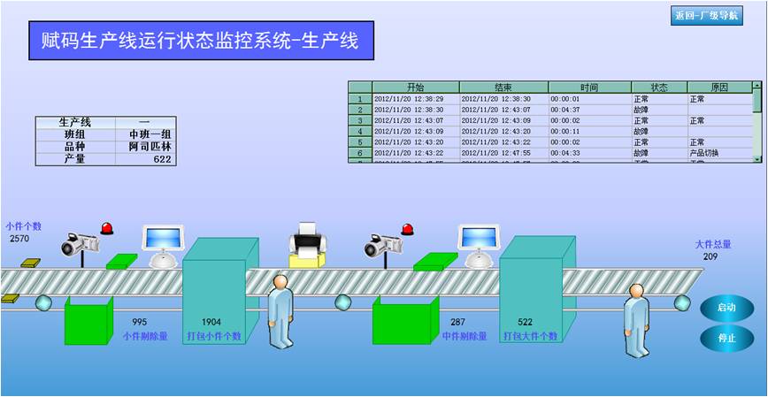 實(shí)時(shí)狀態(tài)畫面:顯示單條生產(chǎn)線的實(shí)時(shí)運(yùn)行狀態(tài),包括各個打包階段的產(chǎn)出數(shù)量,剔除數(shù)量,設(shè)備狀態(tài)等;另外實(shí)時(shí)顯示當(dāng)前生產(chǎn)的班次、品種和最終產(chǎn)量。