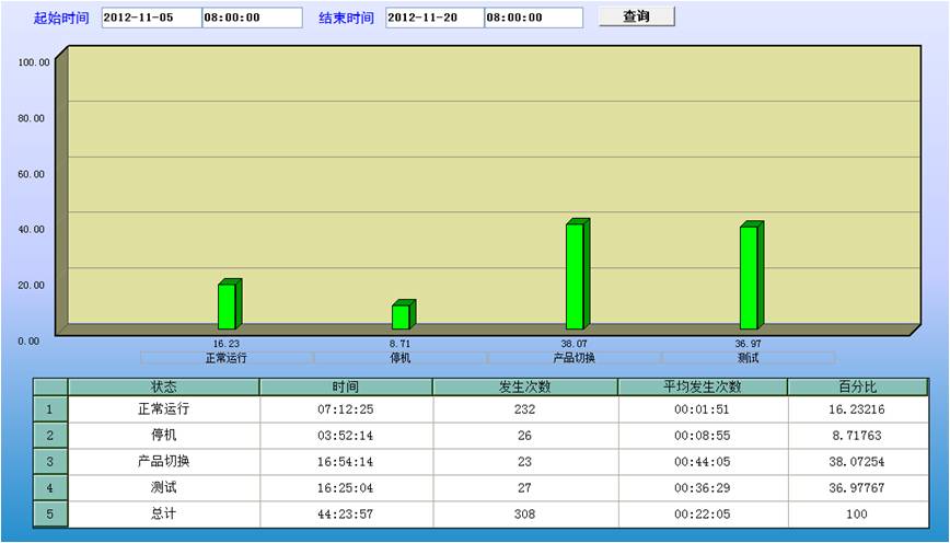 生產(chǎn)狀態(tài)報(bào)表:能夠查詢某一時(shí)間范圍內(nèi)的各種狀態(tài)發(fā)生的起始時(shí)間,并按狀態(tài)類型給出全局對比,給出某一狀態(tài)在該時(shí)間段內(nèi)發(fā)送的總時(shí)間、發(fā)送的次數(shù)、平均發(fā)生時(shí)間和時(shí)間的百分比對比。
