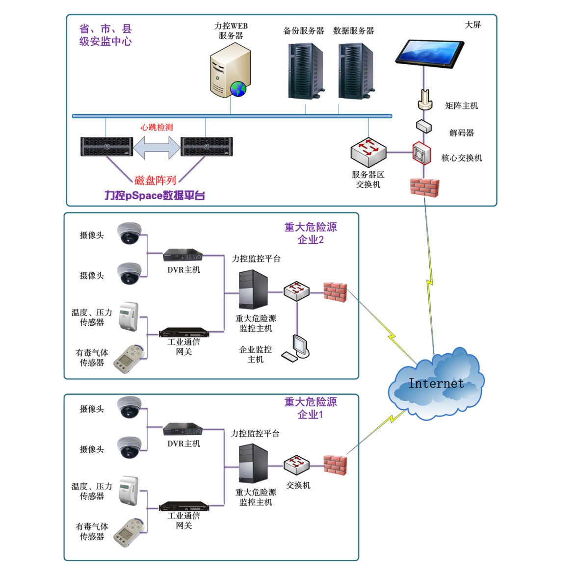 一、概述 隨著社會經(jīng)濟(jì)和文化生活的不斷發(fā)展,公眾服務(wù)和公共安全就成為政府部門和各行業(yè)部門的一個非常重要的工作。提高政府及各行業(yè)部門對緊急、突發(fā)事件的快速反應(yīng)和抗風(fēng)險的能力,建設(shè)救援指揮系統(tǒng)為公眾提供更快捷的緊急救助服務(wù),已成為社會一個迫切的課題。對重大突發(fā)事件的現(xiàn)場高效指揮調(diào)度處理能力已經(jīng)成為現(xiàn)代化管理程度的重要標(biāo)志之一。 隨著城市建設(shè)的發(fā)展,一些有毒、有害、易燃、易爆等危險源有明顯向城市整體區(qū)域擴(kuò)散的趨勢,由此產(chǎn)生的火災(zāi)、爆炸和毒物泄漏等重大災(zāi)害事故也屢屢發(fā)生,嚴(yán)重危及了城市安全。為了城市的安全,必須把城市重大危險源的控制與管理提到重要位置。 危險源對象是指工業(yè)生產(chǎn)過程中所需的以及各種生產(chǎn)場所擁有的設(shè)施或設(shè)備,如罐區(qū)、庫區(qū)、生產(chǎn)場所等對象。這些對象有各種易燃、易爆、毒性等危險物質(zhì),對安全生產(chǎn)和人身安全構(gòu)成了極大的威脅。它們的特性參數(shù)是重大危險源監(jiān)控預(yù)警系統(tǒng)所要關(guān)注的主要參數(shù),將這些參數(shù)進(jìn)行數(shù)據(jù)采集,轉(zhuǎn)換成計算機(jī)所能識別的信號,進(jìn)行計算機(jī)對重大危險源的檢測、監(jiān)視、預(yù)警和控制,預(yù)防重大事故的發(fā)生,實(shí)現(xiàn)安全生產(chǎn)的目的。 二、系統(tǒng)架構(gòu)設(shè)計 在可燃?xì)怏w、危險化學(xué)品、固體廢棄物、危險設(shè)備等行業(yè),實(shí)時監(jiān)測重大危險源和其他高風(fēng)險場所、裝置的運(yùn)行和管理狀況,提高安全監(jiān)管部門和相關(guān)單位的安全生產(chǎn)日常監(jiān)管、風(fēng)險管理、預(yù)測預(yù)警和應(yīng)急處置能力,有效降低安全生產(chǎn)事故率,并為市領(lǐng)導(dǎo)掌控本市安全生產(chǎn)總體情況提供服務(wù)。 從政府角度分析: ◆ 通過本系統(tǒng)能夠?yàn)楦骷壈脖O(jiān)部門全面、準(zhǔn)確、快捷掌握生產(chǎn)企業(yè)的實(shí)時生產(chǎn)狀況。 ◆ 通過本系統(tǒng)能夠幫助各級安監(jiān)部門全面掌握所監(jiān)管的各個生產(chǎn)企業(yè)的安全生產(chǎn)情況,如各企業(yè)的基本情況、各企業(yè)重大危險源的情況、應(yīng)急預(yù)案、生產(chǎn)過程中的規(guī)范要求及安全人員的監(jiān)督狀況等,實(shí)現(xiàn)企業(yè)的安全監(jiān)管。 ◆ 通過此系統(tǒng)能夠幫助各級安監(jiān)部門監(jiān)管各類重大危險源詳細(xì)的生產(chǎn)狀況及位置分布。 從企業(yè)角度分析: ◆ 可對各類涉及安全生產(chǎn)重要崗位的人員和操作過程進(jìn)行監(jiān)控錄像。 ◆ 對各類涉及安全生產(chǎn)車間、倉庫等場所的重要數(shù)據(jù)(如有毒氣體濃度、溫度、壓力)進(jìn)行監(jiān)測,超限時進(jìn)行報警。 ◆ 可對安全生產(chǎn)內(nèi)部管理文件、信息進(jìn)行網(wǎng)絡(luò)發(fā)放、申報。 ◆ 可對危險化學(xué)品儲罐區(qū)、倉庫等進(jìn)行監(jiān)控錄像。 ◆ 通過網(wǎng)絡(luò),如計算機(jī)、手機(jī),企業(yè)管理人員不管身在何處,可以實(shí)現(xiàn)對本企業(yè)重點(diǎn)部門的實(shí)時現(xiàn)場監(jiān)控,并可發(fā)出相關(guān)指令。 系統(tǒng)總體框架如下: