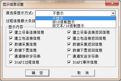 顯示方式設置為16進制顯示或按文本/16進制顯示,具體選擇哪一個,視驅(qū)動通訊協(xié)議而定,如果設備驅(qū)動協(xié)議是ASCII碼,建議選擇按文本/16進制顯示;如果設備通訊協(xié)議是二進制方式,建議選擇16進制顯示。