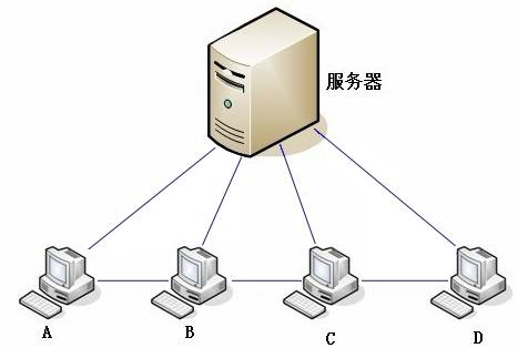首先給大家簡單的介紹一下腈綸廠項目某車間的操作流程,它的現(xiàn)場是有5臺電腦,A,B,C,D和服務(wù)器Server。其中B,C,D是生產(chǎn)數(shù)據(jù),然后通過SQL Server的存儲過程功能把數(shù)據(jù)上傳到服務(wù)器,A機(jī)的主要作用就是按照條件查詢B,C,D每天生產(chǎn)的數(shù)據(jù)然后生成報表。下面是此車間的網(wǎng)絡(luò)示意圖: