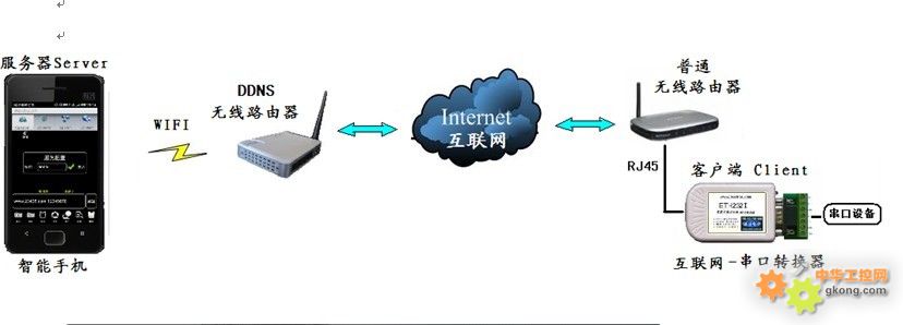 智能手機(jī)接的必須是帶DDNS的無線路由器,特點(diǎn)就是帶固定域名,這個(gè)固定域名永遠(yuǎn)指向本DDNS無線路由器的互聯(lián)網(wǎng)(外網(wǎng)或者稱為WAN口)IP地址。DDNS無線路由器具有普通的無線路由器的全部功能。遠(yuǎn)端上網(wǎng)可以用普通的無線路由器即可,這個(gè)普通無線路由器的LAN網(wǎng)口用RJ45網(wǎng)線接波仕ETH232I型號(hào)的互聯(lián)網(wǎng)-串口轉(zhuǎn)換器,ETH232I帶的串口(RS-232、RS-485、RS-422)可以接串口設(shè)備。