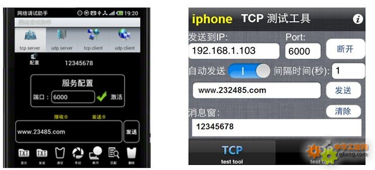 以上的設(shè)置都正確后就可以進(jìn)行互聯(lián)網(wǎng)串口通信了。在Android智能手機(jī)上安裝TCP-TEST.APK(TCP網(wǎng)絡(luò)調(diào)試助手),運(yùn)行TCP網(wǎng)絡(luò)助手,選中“tcp server”,鍵入端口(6000),按“激活”即可。在蘋果iphone手機(jī)上安裝TCP/UDP測試工具,使用方法是一樣的。