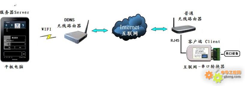 平板電腦設(shè)置成為服務(wù)器,遠(yuǎn)端的互聯(lián)網(wǎng)-串口轉(zhuǎn)換器作為客戶端。DDNS路由器設(shè)置的關(guān)鍵是“端口映射”,就是讓DDNS無線路由器知道控制它的平板電腦具體是哪一臺,這就必須在DDNS路由器設(shè)置中填上用戶所用的平板電腦的無線IP地址,體現(xiàn)在DDNS路由器設(shè)置中對應(yīng)的就是一個(gè)端口號。
