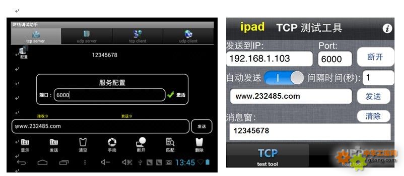 以上的設(shè)置都正確后就可以進(jìn)行互聯(lián)網(wǎng)串口通信了。在Android平板電腦上安裝TCP-TEST.APK(TCP網(wǎng)絡(luò)助手),運(yùn)行TCP網(wǎng)絡(luò)助手,選中“tcp server”,鍵入端口(6000),按“激活”即可。ipad上安裝TCP/UDP測試工具,使用方法是一樣的。