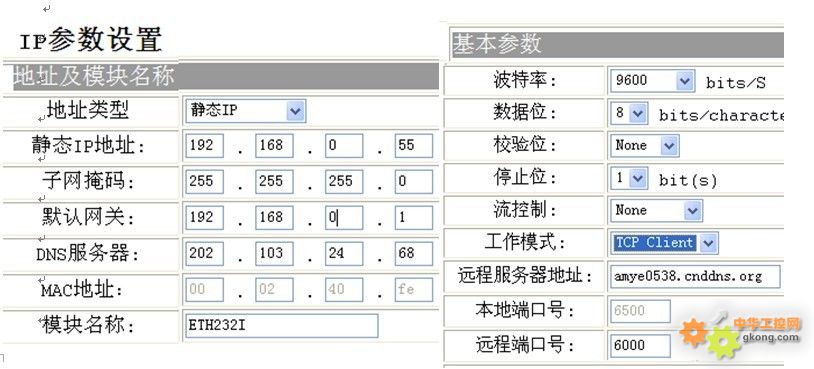 靜態(tài)IP地址就是ETH232I的IP地址,可以修改。默認(rèn)網(wǎng)關(guān)就是產(chǎn)品所接的無線路由器的內(nèi)網(wǎng)IP地址(寫在路由器的外殼上)。DNS服務(wù)器上當(dāng)?shù)氐幕ヂ?lián)網(wǎng)域名解析的服務(wù)器,比如武漢電信為202.103.24.68,其它地方的DNS地址請到互聯(lián)網(wǎng)上查詢。串口設(shè)置可以設(shè)置串口的速率、格式。工作模式 選擇:TCP Client。遠(yuǎn)程服務(wù)器地址 就是DDNS無線路由器內(nèi)置的固定域名。遠(yuǎn)程端口號 可以就用6000,本地端口號 可以就用6500。