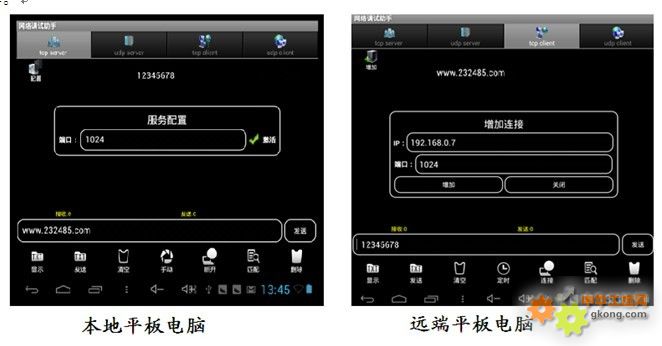 現(xiàn)在2臺Android平板電腦就可以通過光纖進(jìn)行通信了。成功連接后,可以在發(fā)送區(qū)輸入你要發(fā)送的數(shù)據(jù)或字符。如果這時遠(yuǎn)端平板電腦發(fā)送數(shù)據(jù)比如“12345678”,那么這些數(shù)據(jù)將透明傳輸?shù)奖镜仄桨咫娔X的網(wǎng)絡(luò)助手的界面中,并在接收區(qū)顯示“12345678”。反向通信也一樣。