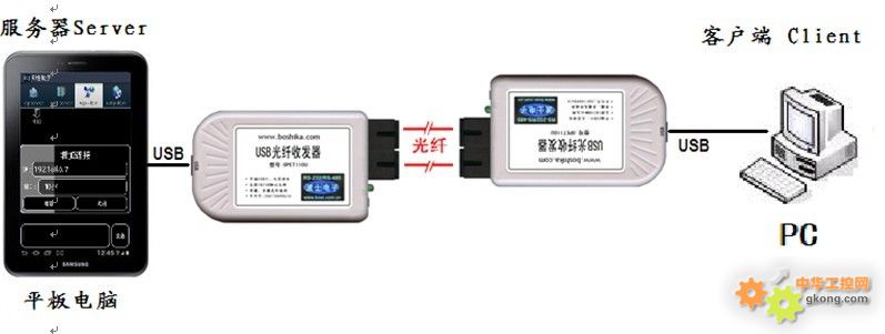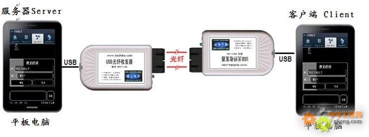 Android平板電腦通過USB口接波仕電子OPET110U的USB光纖收發(fā)器轉(zhuǎn)換出光纖,另外一端的計算機(jī)也是是在USB口外接同型號的USB光纖收發(fā)器。通過光纖將雙方連接起來。