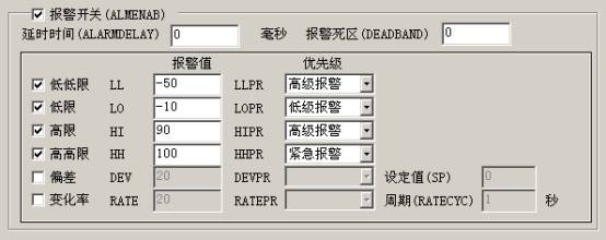 對(duì)過程變量的測(cè)量值設(shè)置一系列的限值,當(dāng)測(cè)量值越過限值時(shí),就會(huì)產(chǎn)生限值報(bào)警。限值共有4種,即低低限、低限、高限、高高限,注意它們都必須在測(cè)量值的量程范圍內(nèi),并且它們的數(shù)值必須依次增大。當(dāng)測(cè)量值越限時(shí),并不是針對(duì)于每一個(gè)限值都產(chǎn)生一個(gè)報(bào)警,而是僅產(chǎn)生最近越限的報(bào)警。比如當(dāng)測(cè)量值越過高高限時(shí),并不是會(huì)產(chǎn)生高限和高高限兩個(gè)報(bào)警,而是僅產(chǎn)生一個(gè)高高限報(bào)警。