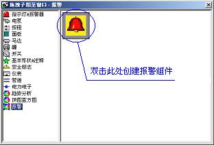 在對(duì)話框的左側(cè)選擇報(bào)警組,并且在右側(cè)雙擊圖中所示圖標(biāo)或托拽該圖標(biāo)到窗口中,即可在當(dāng)前窗口中創(chuàng)建報(bào)警組件。