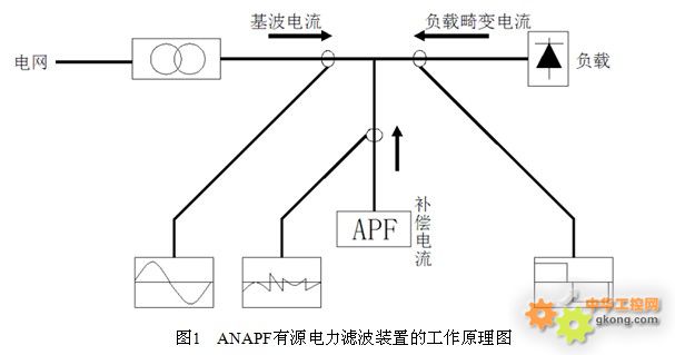 ANAPF系列有源電力濾波裝置,以并聯(lián)的方式接入電網(wǎng),通過(guò)實(shí)時(shí)檢測(cè)負(fù)載的諧波和無(wú)功分量,采用PWM變流技術(shù),從變流器中產(chǎn)生一個(gè)和當(dāng)前諧波分量和無(wú)功分量對(duì)應(yīng)的反向分量并實(shí)時(shí)注入電力系統(tǒng),從而實(shí)現(xiàn)諧波治理和無(wú)功補(bǔ)償。(見(jiàn)圖1)