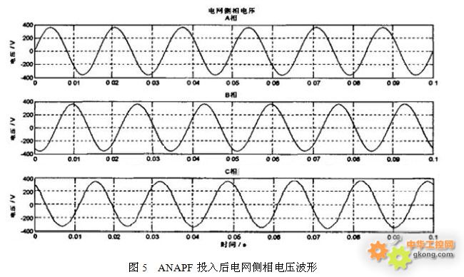 由ANAPF計(jì)算出的補(bǔ)償電流指令信號(hào),因補(bǔ)償電流和諧波電流(以及無(wú)功電流)幅值相等相位相反,所以會(huì)相互抵消,從而使得電網(wǎng)電流變成只含基波的正弦形狀。圖5和圖6為ANAPF投入電網(wǎng)后電網(wǎng)側(cè)的電壓電流波形,與未投入時(shí)的波形圖(圖2和圖3)對(duì)比可以發(fā)現(xiàn)濾波效果顯著,ANAPF投入后的電壓電流波形都十分接近正弦波。