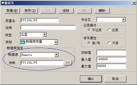提示:如果有兩個數(shù)據(jù)庫的變量同名,如上例中在本地數(shù)據(jù)庫中已經(jīng)存在一個變量PT1154.PV,而且需要同時訪問這兩個變量,則在定義變量時,把其中的任何一個定義為其它名稱,如把Remote的PT1154.PV定義為RPT1154.PV即可。