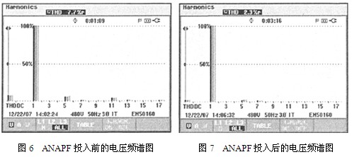 經過計算及慎重考慮后,用戶選定了安科瑞公司的 ANAPF 系列有源 電力 濾波裝置進行諧波治理。 ANAPF100-400/B 投入運行前后的系統(tǒng)諧波如下(圖 2-11 ):