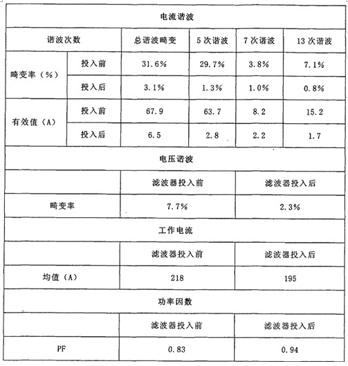 對于現場 600V 電網的電網質量和功率因數均有較大的改善,通過下面濾波器和無功補償裝置投入前后的數據比較,也可說明改善的效果。
