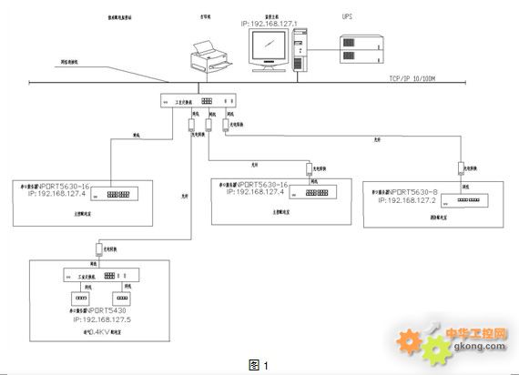 對藍礬化工管理方提出的需求和我們確定的組網(wǎng)方案,站控管理層設備層采購DELL主機,三星19寸顯示器,SANTAK的UPS;網(wǎng)絡通訊層使用MOXA的NPORT5630-8串口服務器和MS1102的光電轉(zhuǎn)換器以及3C16470的網(wǎng)絡交換機;現(xiàn)場設備層采用上海安科瑞公司PZ96-E4系列網(wǎng)絡電力儀表,總線鋪設屏蔽雙絞線,以滿足系統(tǒng)組網(wǎng)的要求。