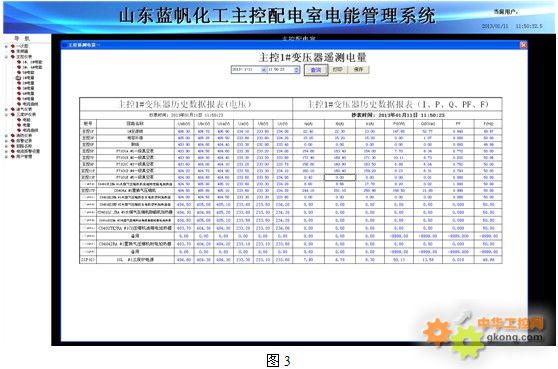 5.2. 遠程抄表查詢:各個配電室各個回路按照時間段進行歷史數(shù)據(jù)查詢。選擇回路后,可選擇時間間隔、時間長度對該回路進行歷史數(shù)據(jù)精確查詢,包括電壓、電流、功率、功率因數(shù)和電能等常用數(shù)據(jù)。查詢結(jié)果可導出成EXCEL表格進行保存,也可打印保存,如圖3