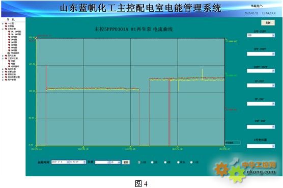 5.3趨勢曲線:功率實時趨勢顯示及歷史趨勢查詢功能。選擇回路后,該回路實時趨勢曲線會不斷刷新,選擇“起始時間”可查看該回路歷史趨勢曲線,選擇“時間長度”可查看歷史日、月、年趨勢曲線,能更加直觀反映該回路運行情況,如圖4: