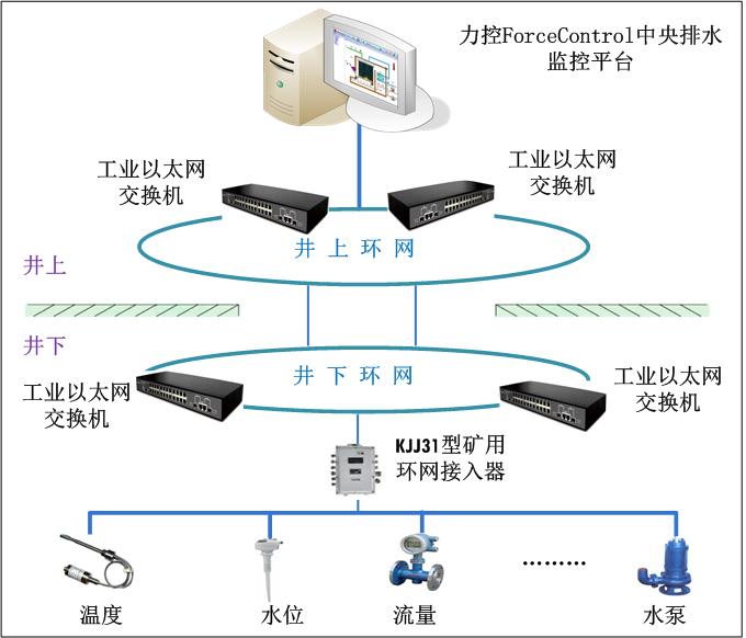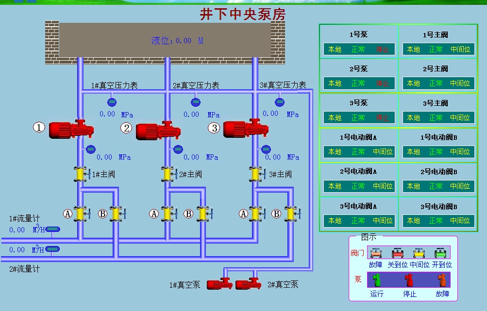 三、系統(tǒng)功能 井下主排水監(jiān)控系統(tǒng)實現(xiàn)水泵運行自動化,保證水泵安全穩(wěn)定運行,該系統(tǒng)主要具備以下5部分功能。 (1)數(shù)據(jù)采集分析及保護:系統(tǒng)可采集與監(jiān)測水泵、電機、各個排水管、閥門、水倉等所有現(xiàn)場設備的實時數(shù)據(jù),并且可以實時顯示各個設備的工作狀態(tài),通過預先設定好的控制策略可對現(xiàn)場設備進行聯(lián)鎖保護控制。 (2)通訊:PLC控制器配備以太網(wǎng)通訊模塊,可把PLC接入井下工業(yè)網(wǎng),中央泵房PLC接入井下中央變電所環(huán)網(wǎng)交換機,經(jīng)井上井下環(huán)網(wǎng)將水泵機組實時的運行信息傳到地面監(jiān)控系統(tǒng)。支持標準OPC接口實現(xiàn)無縫交互功能。 (3)顯示功能:系統(tǒng)可實時顯示現(xiàn)場排水工藝流程,通過圖形動態(tài)顯示水泵、閥門、運行狀態(tài),直觀地顯示水泵的工作狀態(tài)和電動閥的開閉位置,實時顯示水泵抽真空情況和出水口壓力、流量等實時值。 (4)報警功能:系統(tǒng)通過高度模擬現(xiàn)場排水工藝流程,采用改變圖形顏色和閃爍方式進行事故報警,直觀地顯示水泵及相關設備的工作狀態(tài)。如水位、壓力、電機軸溫、水泵外殼溫度等的超限報警,自動記錄報警信息以便工程師分析故障信息。 (5)數(shù)據(jù)記錄和存儲功能:地面監(jiān)控系統(tǒng)實時采集重要參量并進行定期存儲,操作員可查詢存儲到歷史數(shù)據(jù)庫的數(shù)據(jù),以報表和曲線的形式展示,并支持打印功能,為技術員分析系統(tǒng)運行狀況提供科學的依據(jù)。