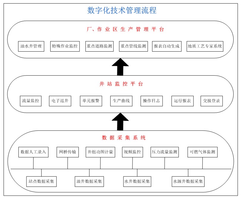 數(shù)字化在信息化整體架構(gòu)上是生產(chǎn)的最前端,以井、站、管線等基本單元的生產(chǎn)過程監(jiān)控為主,完成數(shù)據(jù)的采集、過程監(jiān)控、動態(tài)分析,發(fā)現(xiàn)問題、解決問題維持正常生產(chǎn)。與其他系統(tǒng)建立統(tǒng)一的數(shù)據(jù)接口,實現(xiàn)數(shù)據(jù)的共享,以生產(chǎn)過程管理為主的信息系統(tǒng),是油田信息系統(tǒng)功能的延伸和擴充。所有管理子系統(tǒng)的建設(shè)主要為監(jiān)管、分析、優(yōu)化、更新實際生產(chǎn)相關(guān)的各個環(huán)節(jié)工作,達到高效智能化的企業(yè)化管理目標。油田數(shù)字化管理流程包括數(shù)據(jù)采集系統(tǒng)、井站監(jiān)控平臺、廠、作業(yè)區(qū)生產(chǎn)管理平臺,其框架圖如下: