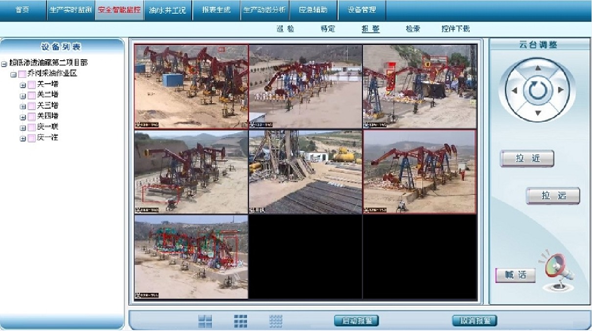 智能分析視頻服務(wù)器占用單臺服務(wù)器,可實現(xiàn)安全防衛(wèi)功能,有人員進入井場時,在增壓點語音報警,自動變大井場畫面,自動拍照、存儲。增壓點(作業(yè)區(qū))值班人員通過變焦操作,對進入井場人員進行識別。通過語音通道播放音頻警示文件(或通過麥克風(fēng)遠程語音警示)。通過服務(wù)器軟件配置使之進行WEB發(fā)布,可以通過B/S模式進行畫面切換。