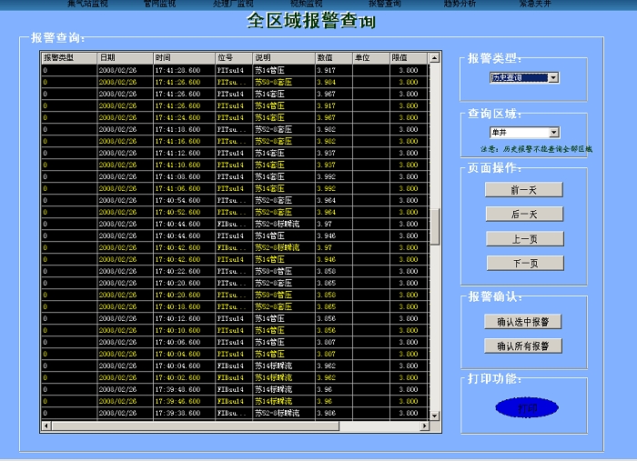 同時通過網(wǎng)絡(luò)數(shù)據(jù)庫將站控相關(guān)可燃氣體標簽變量采集至數(shù)字化平臺pSpace中,根據(jù)不同的站點實施靈活的查詢模式,利用報警控件進行報警數(shù)據(jù)的統(tǒng)計和分析。報警內(nèi)容包括報警數(shù)據(jù)名稱、報警時間、報警時刻數(shù)值、報警類別,報警級別、報警是否確認等,報警字體和背景顏色根據(jù)報警級別和確認狀態(tài)不同而不同。
