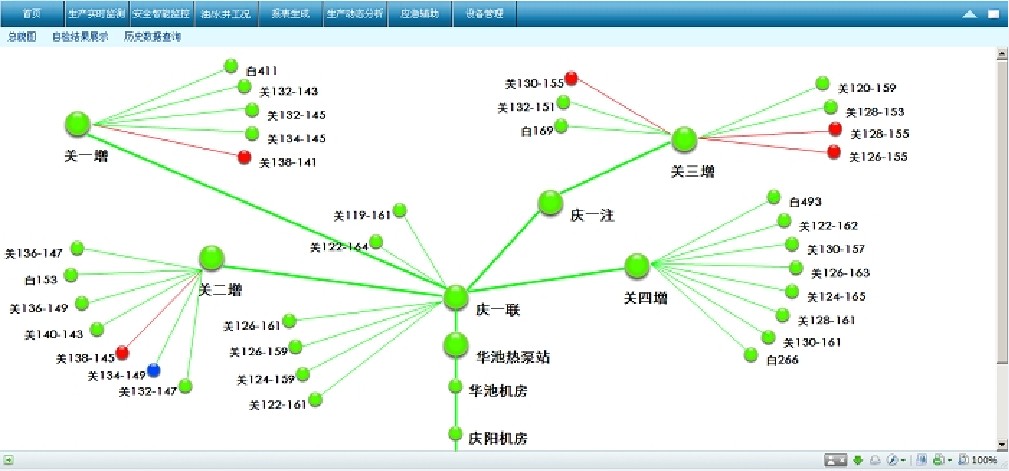 系統(tǒng)主界面展示當(dāng)前站點、井場以及單井的網(wǎng)絡(luò)通訊、現(xiàn)場在用儀表設(shè)備的工作狀態(tài)。儀器儀表設(shè)備包括一體化載荷位移傳感器、RTU等。當(dāng)網(wǎng)絡(luò)拓撲圖上的綠色圖標變?yōu)榧t色,說明當(dāng)前系統(tǒng)中的網(wǎng)絡(luò)設(shè)備出現(xiàn)故障。紅色圓點代表當(dāng)前展示的井場及其下轄單井設(shè)備工作狀態(tài)異常。當(dāng)網(wǎng)絡(luò)拓撲圖上的綠色圖標變?yōu)樗{色,說明當(dāng)前系統(tǒng)中的儀器儀表工作狀態(tài)異常。同時此系統(tǒng)還具備查看實時故障信息以及歷史故障信息的功能。