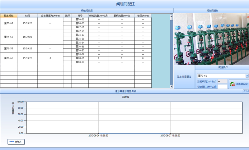 關(guān)于供注水分析系統(tǒng),主要是實時顯示供注水管網(wǎng)、注水井、水源井運行狀態(tài)和相關(guān)參數(shù)。各個界面均可顯示實時及歷史數(shù)據(jù);由標準化站控系統(tǒng)完成對注水井及閥組的監(jiān)控,一方面可以選擇需要設(shè)定的注水井進行注水量設(shè)定,另一方面可以通過設(shè)置注水井注水壓力和瞬時流量波動上下限,若超限則系統(tǒng)會及時報警。