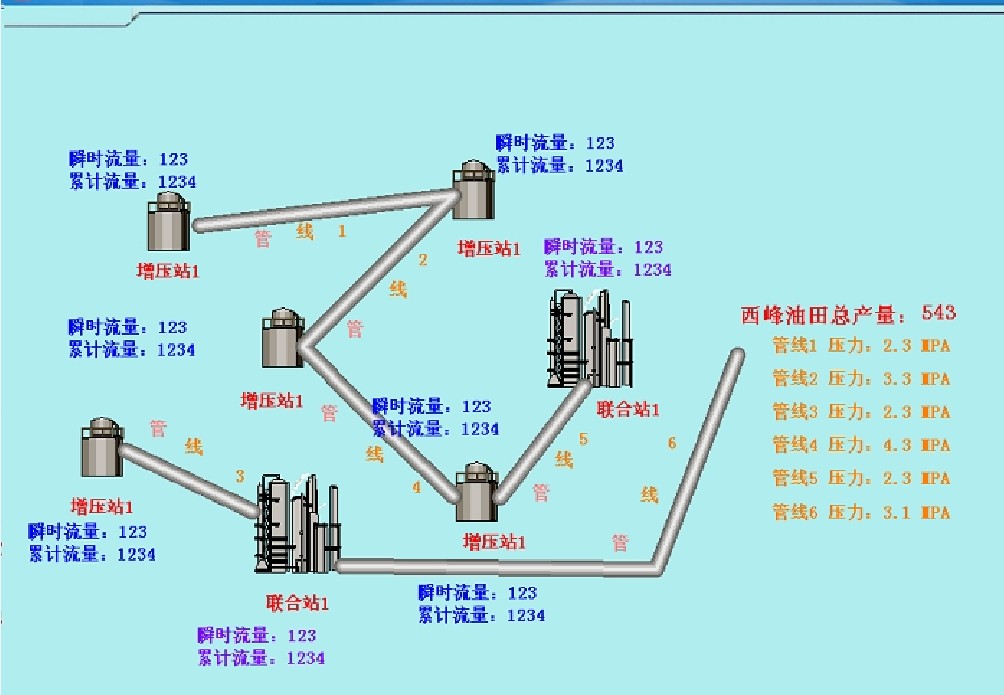 采集自噴井、抽油機井、電潛泵井、螺桿泵井、注水井、配水間、注水站、油水集輸管網(wǎng)、增壓站、轉(zhuǎn)油站、集輸站、罐區(qū)等生產(chǎn)場所裝置的實時生產(chǎn)數(shù)據(jù),包括壓力、溫度、流量、液位、電流、電壓、轉(zhuǎn)速、功率、載荷、沖程、沖次等運行參數(shù)數(shù)據(jù)。并且包括油井的示功圖計量數(shù)據(jù),將增壓站、注水井、接轉(zhuǎn)站、聯(lián)合站等以力控油汽版本軟件制作好的工藝畫面文件拷貝至數(shù)字化平臺的工程文件夾中進行快速編譯,可達到快速組態(tài)的目的,做到管理平臺與站控的畫面高度統(tǒng)一,實現(xiàn)生產(chǎn)實時、智能監(jiān)控 。