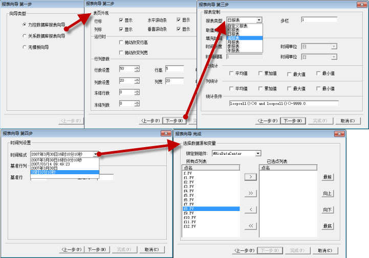 專家報表 專家報表是力控科技在長期開發(fā)實踐的基礎上推出的功能強大、技術成熟的報表組態(tài)工具。主要適用于工業(yè)自動化領域,是解決實際開發(fā)過程中的圖表、報表顯示、輸入、打印輸出等問題的強大工具。組態(tài)工程師采用專家報表組件可以方便快捷的組態(tài)出專業(yè)的報表界面,并可根據自身項目需求任意設計定制報表內容。與手工制表相比,大大提升了工作效率,減少了繁復的工作量。 報表數據源支持實時數據庫和各種關系數據庫,可顯示、處理、查詢數據庫中的實時和歷史數據。 專家報表提供類似 EXCEL 的電子表格功能,可實現形式更為復雜的報表格式,為用戶提供一個方便,靈活,高效的報表系統(tǒng)。 1) 專業(yè)的報表向導 力控科技通過多年來總結用戶的使用習慣和使用頻率,開發(fā)的報表向導功能,無論是制作本地數據庫報表還是關系數據庫報表,都可使用戶在最短的時間內完成。通過向導中的簡單的幾步就可完成報表的制作,并且可自動生成日報表,月報表,年報表,班報表,自定義報表等。