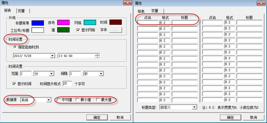 歷史報表 歷史報表提供了一種瀏覽歷史數據和統(tǒng)計數據的工具。歷史報表從數據庫中按照一定的采樣方式獲取一個或多個點的歷史數據,查詢數據庫存儲的指定時間段和點名的歷史數據,以點列表的形式顯示出來。數據源可以是本地數據源也可以是遠程數據源,同一張歷史報表可顯示28個點的歷史數據,同一窗口可使用多個歷史報表。如下圖進行時間、數據源、數據統(tǒng)計和數據點的設置。